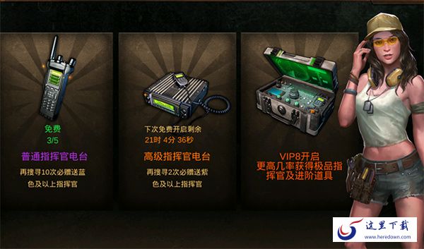 招募指挥官只有一个渠道,那就是从营地里的通讯塔里面指挥官电台招募。电台分三种,普通指挥官电台,高级指挥官电台,VIP8电台。普通电台可以招募到橙色指挥官,不过几率最低,其次是紫色,最后是蓝色,或者是绿色。