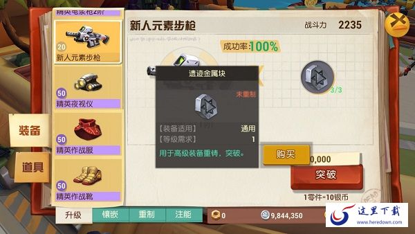 当武器到达一定等级时(例如20级),将会发现身上的装备不能再继续升级了,这个时候就必须对装备进行“突破”,使装备的整体品质得到上升,装备原有的基础属性也会发生一些变化。突破需要使用到特殊的材料,这些材料可以通过日常任务中得到,从摆摊玩家处购买或者在商城中购入。