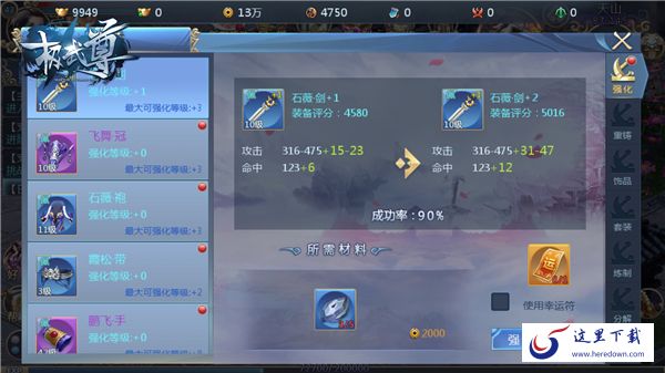 1、装备强化:武器、衣服、护腕、腰带、靴子、项链、玉佩、护符、戒指和头饰都可以使用强化石进行强化,强化的级数越高,所需要高级的强化石,装备强化的等级最高10
