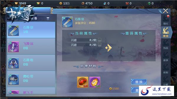 2、装备重铸:装备重铸需要重铸石才可以重铸,重铸会出现随机属性,更有机会获得特殊属性。