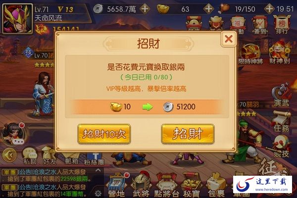 使用招财功能,花费一定数量的元宝兑换银两。VIP等级越高,暴击可能性越高,暴击后获得多倍银两
