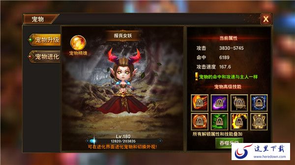 4、宠物:宠物共分成两大块属性,一是基础属性,可以通过吞噬魔兽铃铛和装备提升,等级越高,属性越强;二是宠物进化,通过进化源晶来进行宠物升阶,宠物阶层越高,属性越强,同时也能解锁和升级宠物的技能,战斗力更加猛。