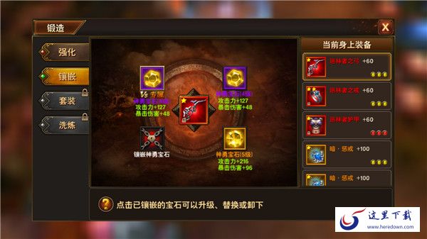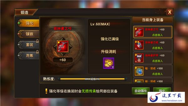 2、强化:装备强化可以获得较高的属性加成,只需要消耗金币,建议玩家尽量将身上的装备全部强化到上限。同时,游戏内有一个强化加成属性,身上装备总强化的等级越高,获得的属性加成越给力。