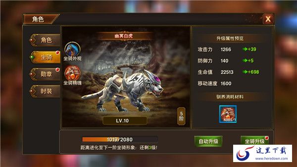 5、坐骑:除了酷炫的外型、奔跑如飞的作用外,战力加成也是杠杠滴。可以通过坐骑升阶石来提升坐骑的等阶,等阶越高,属性加成越给力,外型也更加酷炫。