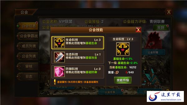 8、公会技能:在公会技能中,一共有3个技能可以提升属性,分别是:生命科技-提升基础生命值比例、攻击科技-提升基础攻击比例、防御科技-提升基础防御比例。