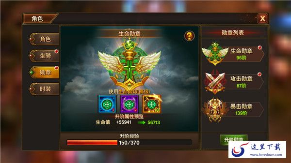 6、勋章:一共有3种勋章,每种勋章的属性都不同,分别有:生命加成、攻击力加成、暴击率以及暴击伤害的加成。勋章可以通过消耗相应的道具升阶,阶段越高,属性加成越给力。