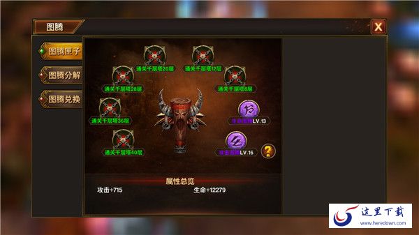 3、图腾:图腾也是提升战力非常快的一个途径,根据玩家通关的千层塔层数不同,可镶嵌的图腾个数也会不同。图腾以红色最佳,可以通过提升图腾等级来提升图腾属性。
