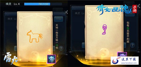 唤灵时需要玩家根据系统提示作画,匹配度越高灵符效果将越好。同时灵符具有橙、蓝、红、紫四种品质,并且自身带有词条属性,唤灵等级的不同将影响获得灵符的品质。