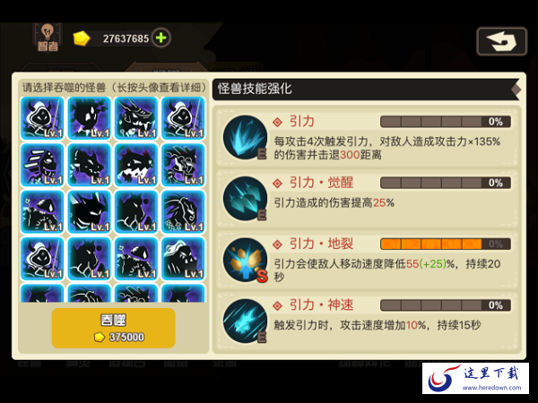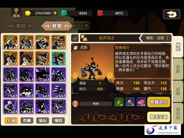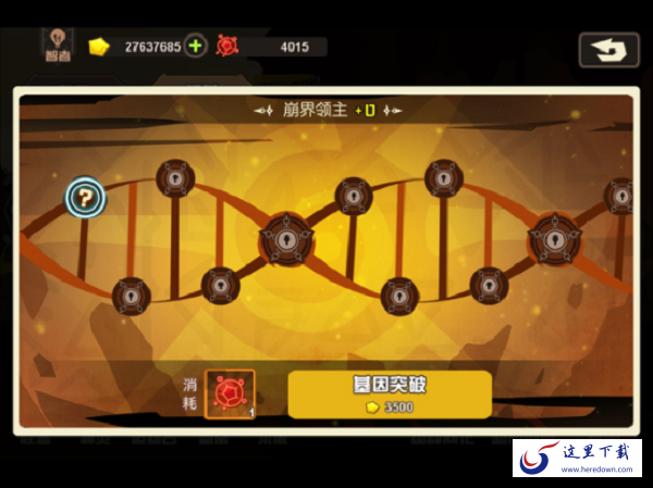 基因突破是个烧钱的玩意,你的怪兽有多么强力取决于你有多少金币,目前版本基因能够突破的等级上限是30。根据崩界领主的定位,我们的突破方向就是:攻击、霸气为主,体力其次。其实这个方向基本符合所有的远程怪物了。