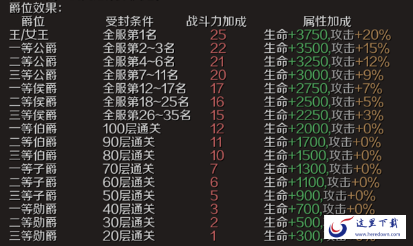 伯爵、子爵、勋爵爵位无受封人数,可以通过挑战恶魔塔的特定层数获得。像王爵、公爵、侯爵由一等伯爵中产生,按照挑战层数高低,并有受封人数限制,挑战层数相同的勇者,排名以完成挑战时间点的先后顺序决定。
