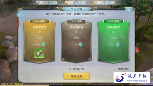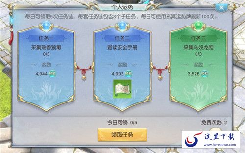 玩家每天可以在“日常活动”选项里面点击“个人运势”来进行参加活动,活动每日可以领取5次任务链,每套任务链包含3个子任务,玩家在完成3个子任务之后相当于完成了一次任务。玩家可以在看到本次个人运势的所付出的价值与收益不成正比,可以选择免费次数进行刷新,把本轮的个人运势给换掉。