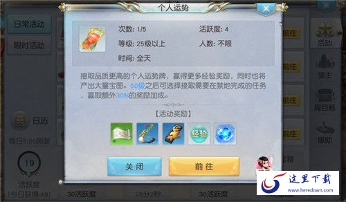 以上内容则为“个人运势”的玩法介绍,个人建议当出现个人运势没有藏宝图的时候,则使用免费刷新来进行更换,因为这活动是奔着藏宝图来的;假设当前任务奖励有藏宝图的时候,就别刷新了,因为刷新不一定都会刷出好任务。