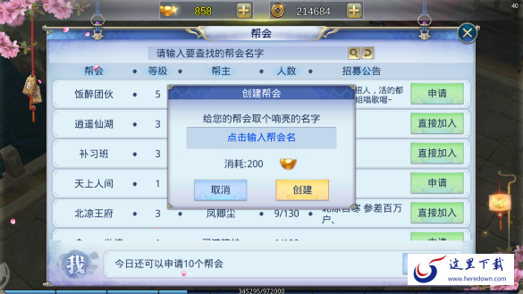 点击右下角的创建帮会后,消耗少量的元宝,确定自己的帮会名称,即可成功创建帮会,创建帮会的少侠是当前帮会的帮主,具有帮会内的最高权利。帮会创建完成后,就可以招兵买马、呼朋唤友一起来勇闯江湖了。
