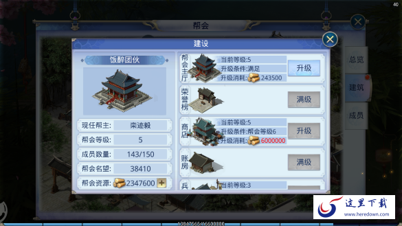 帮会内部有不同种类的建筑,他们各有所用,越繁荣的帮会,帮内成员捐献越多,则每个建筑可升的等级就越高。高等级的建筑内部可产出的物品更好。