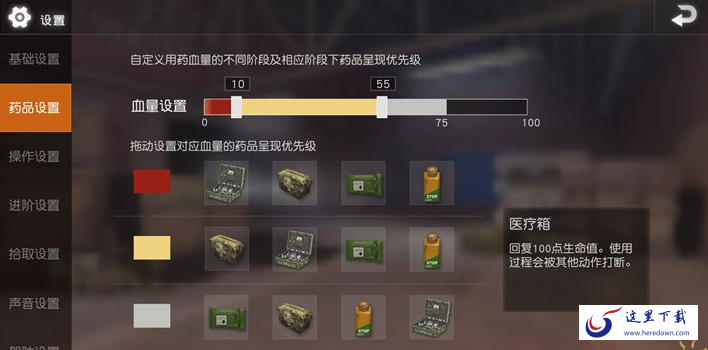 药品设置 可以根据自己的分析,设置成三个阶段,选择在那个阶段自动跳出那个药品,自动跳出,将省去背包里寻找药品的时间,可以想象的比较危险,设置的高点,因为只是跑毒掉血补的话,也不会介意去背包补下。