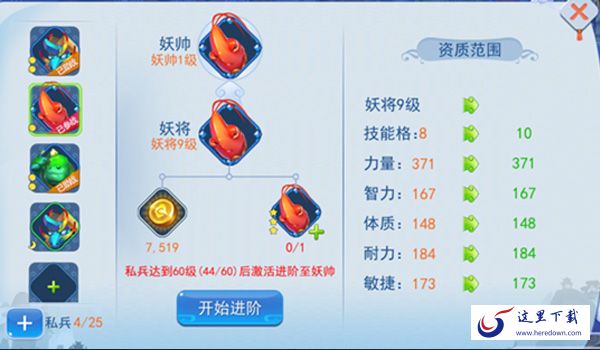 30级开启此功能。目的在于全面提高私兵的属性以及品质。每次进阶需要消耗一只同阶位的私兵作为进阶材料,且私兵需要达到进阶等级要求。