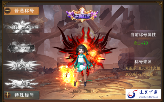 特殊称号有两个,第一个是王者归来,在开服前十天内充值满2000钻石可以激活,加20攻击力;第二个是风暴传说,在开服前十天内充值满5000钻石可以 激活,加50攻击力。