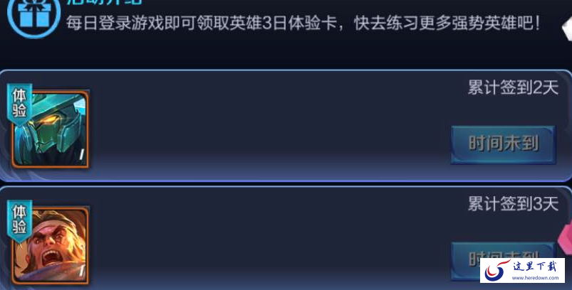 玩家进入游戏就签到,每天都可以领取英雄体验卡,每个英雄的体验卡时长是三天。