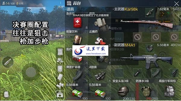 装备并不是越多越好,而是越稀有、伤害越高、用途越广泛,玩家们需要留意背包的空间以及武器的选择上,前期的安全区域比较大,高倍镜能够发挥的作用更大一些。但到了决胜圈,圈子范围较小,全息瞄准镜和红点瞄准镜的作用更为显著,因此决胜圈背包中备有这两件瞄具优势更多一些。武器选择一般是步枪加狙击枪或是步枪或是冲锋枪加步枪,也可以根据个人喜好做选择。另外就是补给品了,2-5个急救包,10个绷带,饮料、手雷、烟雾弹尽可能多带,越后期,派上的用场越大。