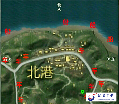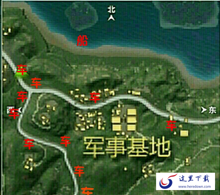 军事基地位于地图的东北方,共有10个刷车点和1个刷船点。