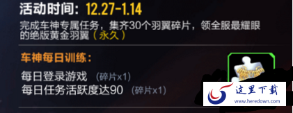 玩家在活动中完成相应的任务就可以获得黄金羽翼的碎片的奖励。车神的每日训练每天可以获得;两个黄金羽翼,还有车神冲级的话也是可以获得相应的碎片的。