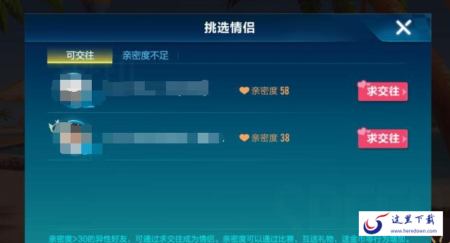 然后挑选情侣,要亲密度达到30以上才能结婚。这个30是很容易的。只要每天互送金币,然后一起组队玩几把游戏就有了。