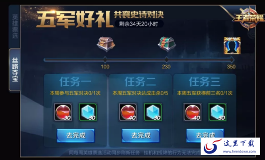 本周参与五军对决1次、本周五军对决达成击杀5次、本周五军对决获得前三名1次,任务要求都不是很难,三次可以获得30+40+40=110积分。