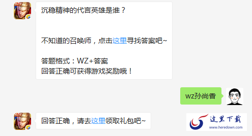 题目:沉稳精神的代言英雄是谁?答题格式:wz+答案,今天的王者荣耀答案小编为大家整理好了,希望对玩家获得微信额外的奖励有帮助,不清楚2月5日王者荣耀游戏每日一题答案的玩家速来看看,希望对大家获得腾讯微信免费发放的奖励有帮助。