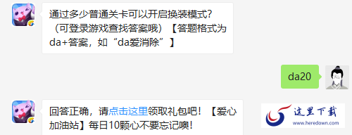 天天爱消除的换装模式相比大家都已经玩过了,不过对于新手玩家而言,回答正确2月13日的每日一题答案很难。在13号的每日一题问题中通过多少普通关卡可以开启换装模式,正确答案是20关卡,不知道答案的赶快回答问题领取奖励吧。