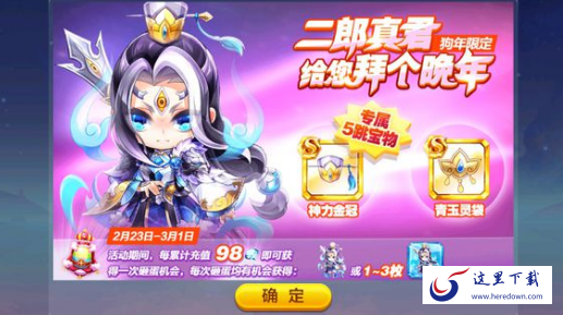 活动内容:活动期间,每充值满98钻石,可以获得一次砸蛋机会,每次有机会获得数量不等的杨戬碎片,10个碎片即可合成完整的二郎真君哦~