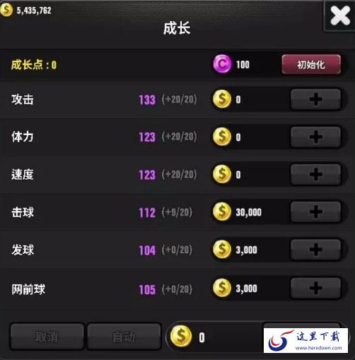 2.注重底线完美型:20点攻击,20点体力,20点速度,20点击球,0点发球,9点网前球。