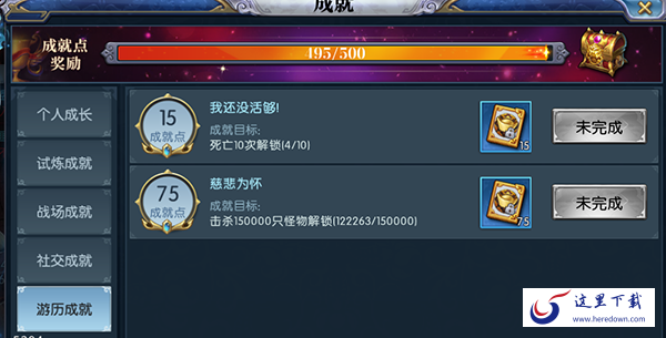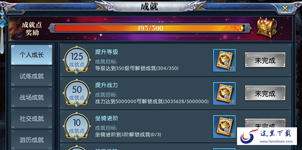 成就类型分为个人成长,试炼成就,战场成就,社交成就,游历成就,不同类型都有每个类型的成就目标,达到目标就可以领取绑定元宝