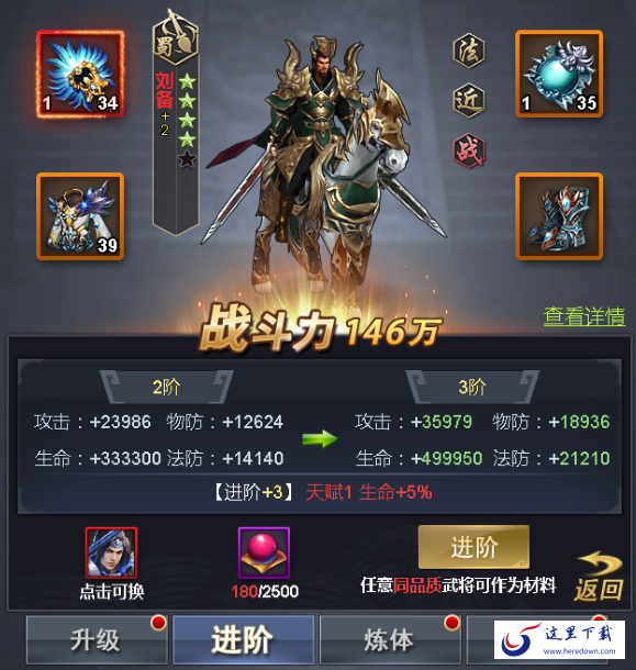 武将进阶,开始只需要进阶丹,后面需要以同品质的武将再加上进阶丹才能进阶喔,在进阶的同时除了增加基础属性外,还可激活武将天赋,从而获得更大的属性提升。