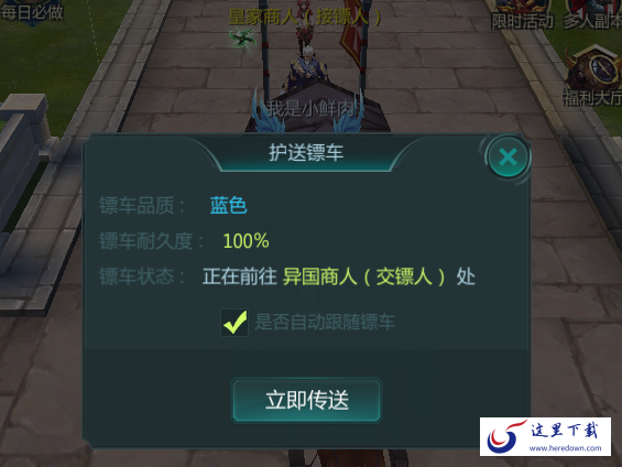玩家从接镖NPC处接到镖车,默认自动跟随护送镖车,但玩家可以自己操作打断跟随,镖车和玩家互不影响,镖车行走路线根据镖车等级分为三条,其他玩家也可以劫镖,当玩家镖车被劫时,玩家可以求助公会,公会其他成员帮忙护送可获得护送奖励,劫镖者也可以获得劫镖奖励。
