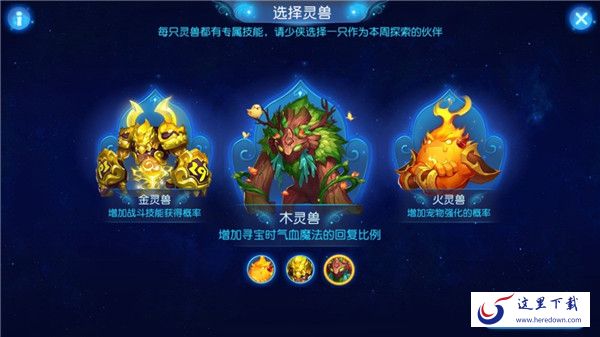 【五行灵兽】五行灵兽各有所长,如木灵兽可增加寻宝时气血魔法的回复比例,火灵兽能增加宠物强化的概率,金灵兽可增加战斗技能获取概率。从挑战过程来讲,由于每场挑战结束后不会自动回复血蓝,需要通过给灵兽投喂三级药和烹饪来恢复。因此,如果想减少三级药和烹饪消耗的玩家,可优先选择木灵兽。