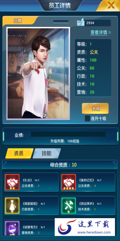 这里的小建议是先把员工等级都升到一百,因为升级到100是只需要用经验来升级的。升级到一百之后就需要提拔员工,可以消耗一定的道具来进行提拔,也就相当于升职,资质越高,为总裁自己增加的实力就越强的哟。