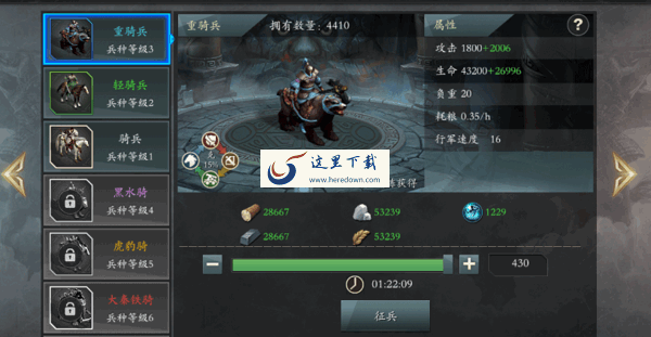游戏中兵种共分为:步兵、弓兵、骑兵、器械4个种类,每个种类的兵种都有各自的特点:步兵生命值和攻击力都很高同时抗暴击能力强,可以作为主力输出;弓兵生命值和攻击力中等但命中率高,可以稳定输出;骑兵生命值和攻击力都较高同时拥有很高的闪避率,机动性较强;器械生命值高攻击力中等,但是拥有较高暴击,可以作为爆发性输出;