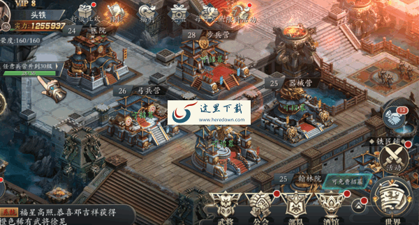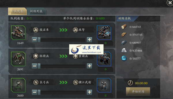 4种士兵都可以在兵营中招募,兵种等级越高,所需要的兵营等级也越高,兵种的招募时间和城池属性、校场等级、科技等级挂钩,部分高级兵种需要占领特定的城镇同时兵营达到一定等级才能招募;每个国都和王城都有特色兵种,国都和王城的拥有者可以训练该兵种。