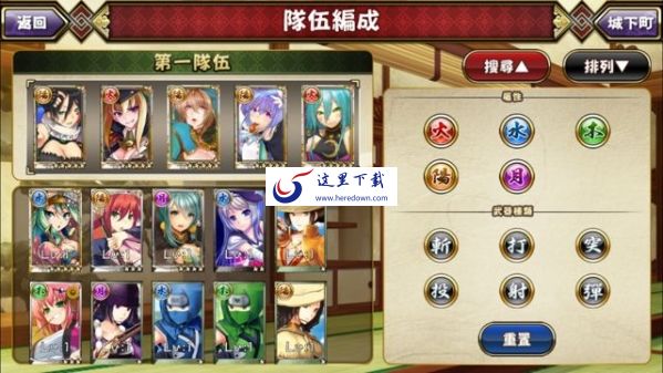 所有的武将都拥有「火」「水」「木」「阳」「月」其中一种属性,相克的属性造成的伤害会增加,受到的伤害会减少