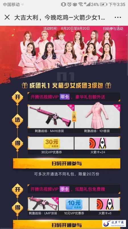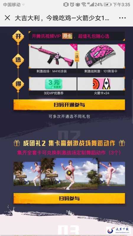 101火箭女团的活动,她们的宣传,开通腾讯视频会员,可以获得对应的奖励。目前是有赠送粉色101套装、粉色降落伞、M416、3个舞蹈动作,这些都是可以获得的。腾讯视频的年卡是188、季卡就是45块,月卡就是15块,开通会员就可以获得的。