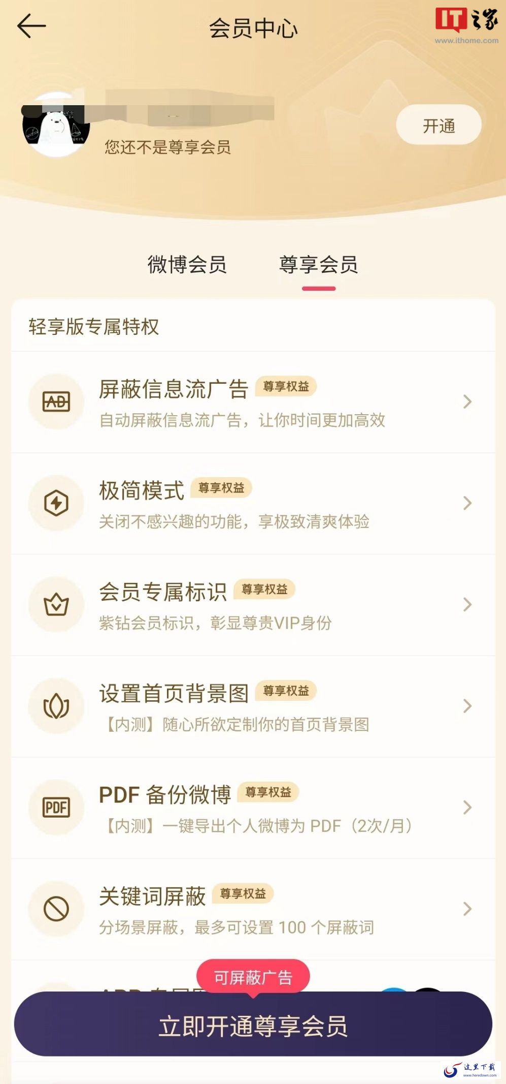 9 月 7 日消息,微博轻享版近日推出尊享会员,为用户提供屏蔽信息流广告、极简模式、会员专属标识、关键词屏蔽、浏览记录、PDF 备份微博等专属特权。