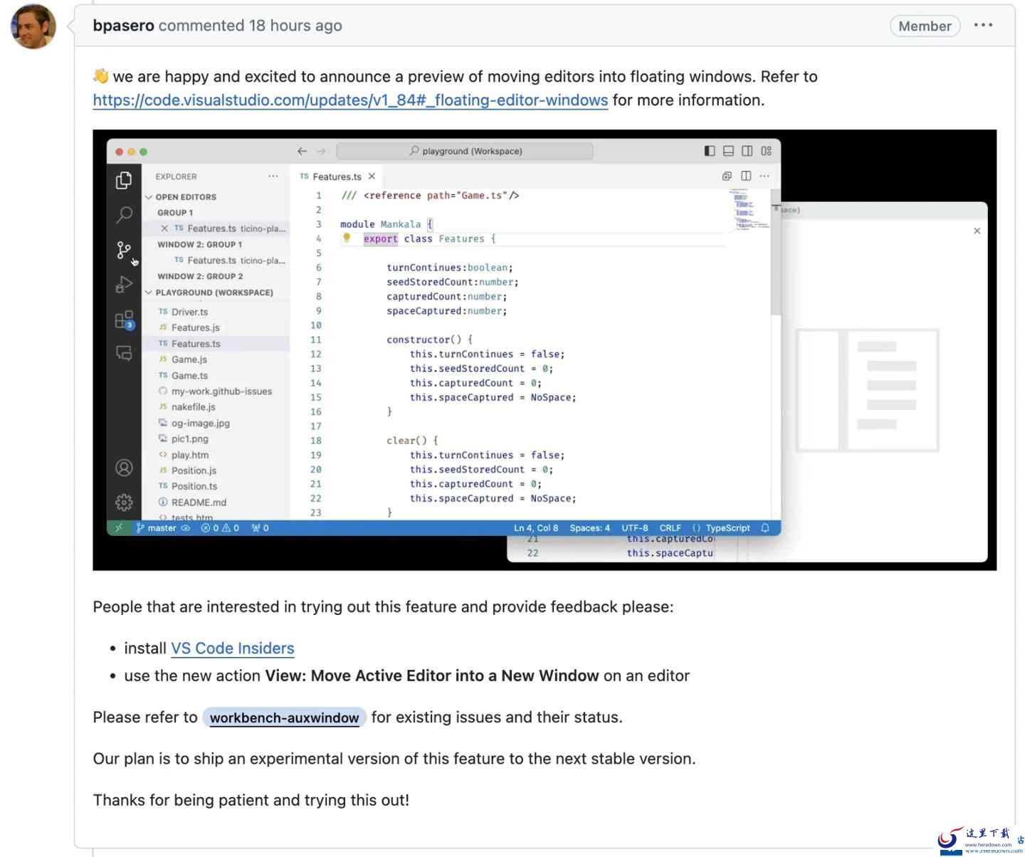 此外,在该版本中还添加了“浮动窗口”预览特性,该提案在 2016 年就有用户提出,目前开发团队正在测试相关功能。