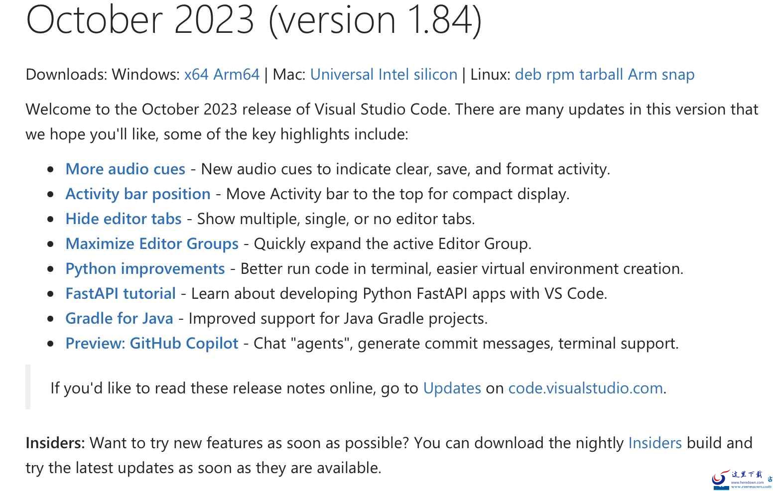 11 月 3 日消息,据官网消息,Visual Studio Code 1.84 版本目前已经发布,主要为这款 IDE 添加了更多音频格式、自定义活动栏位置、隐藏编辑器选项卡,并改进了 Python 性能及 Copilot 功能。