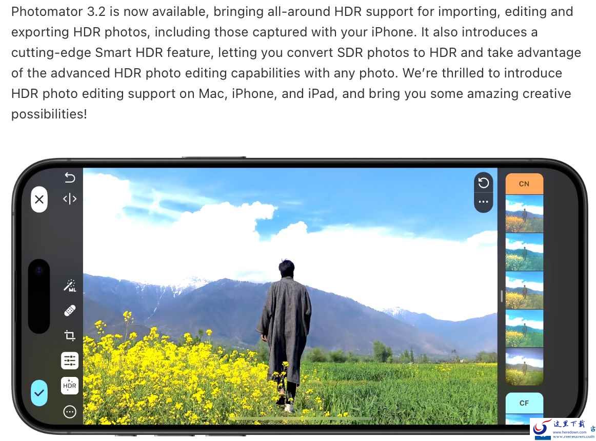 通常情况下,拍摄云层、太阳、或在强光条件下利用 iPhone 拍摄的图像可能会在 SDR 照片中效果不佳。不过用户只需单击一下按钮,就可以立即将 SDR 照片转换为 HDR 使这些照片恢复活力。用户可以编辑和共享保存的所有 HDR 数据 —— 就像任何其他 HDR 照片一样。