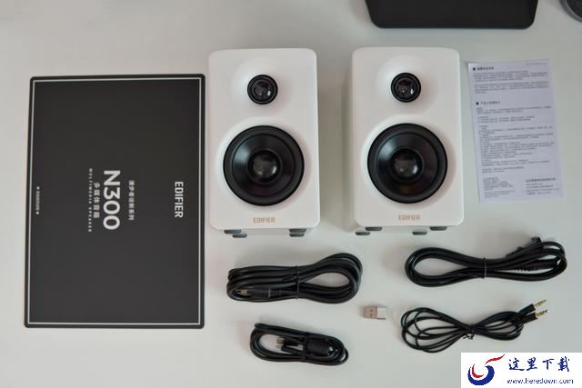 拆箱可以看出,漫步者N300音箱的包装内容包含主机、电源线、AUX音频线、主副箱连接线、Type-C数据线和A/C转接头,配置还是很丰富的,应用场景也广。文字资料主要包含快速指南和保修卡。