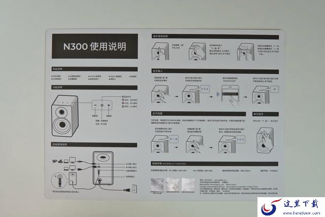 漫步者N300音箱的使用说明是一张硬卡纸,上面通过文字结合图示对于音箱的使用方式介绍得还是很详细的。