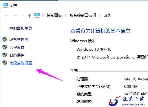 1、右击桌面上的此电脑,选择菜单选项中的“属性”打开,接着点击左侧的“高级系统设置”选项。