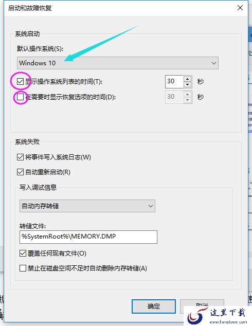 3、接着将“默认操作系统”选为当前使用系统,将下方勾选的选项都取消勾选。