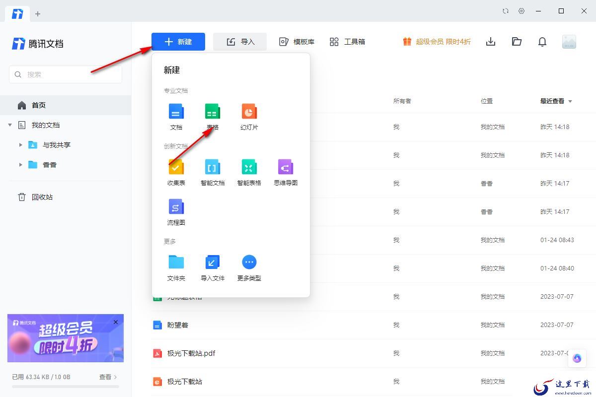 1.首先,我们需要进入到腾讯文档中,点击【新建】-【表格】。