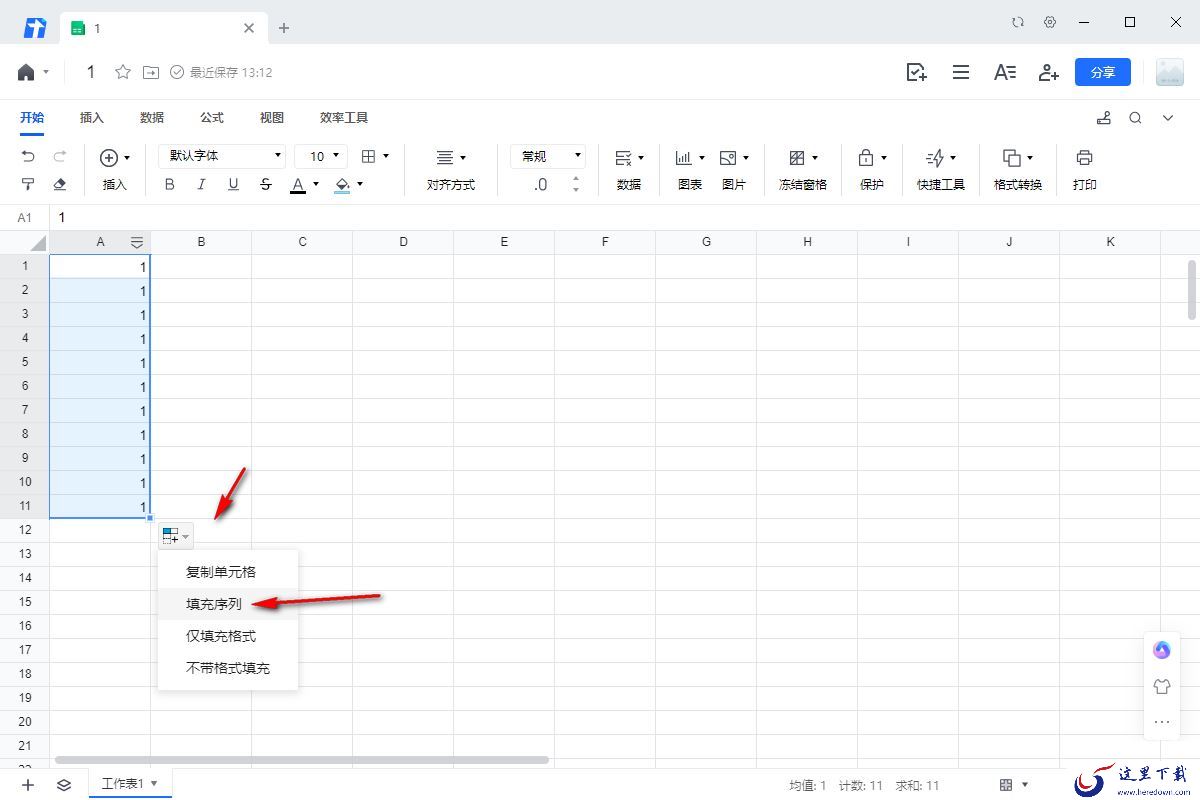 4.这时你会发现填充之后,在右下角的位置有一个图标,点击该图标,选择【填充序列】选项即可。